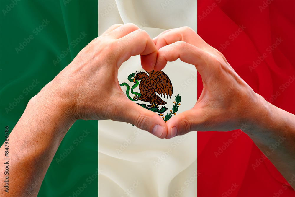 close-up of male hands in heart form against background of silk national flag of Mexico, patriots of country concept, Independence day, travel, international cooperation