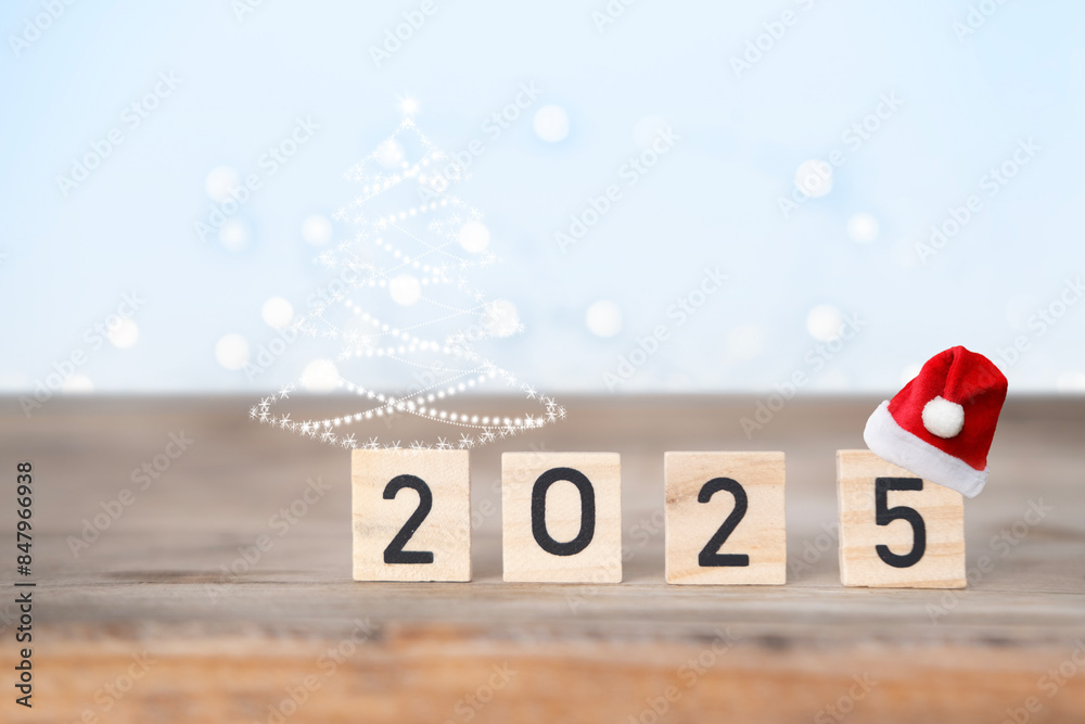 numbers 2025 on vintage wooden table, Santa Claus Hat, start new calendar year, Time Management and Planning, office aesthetics and business settings