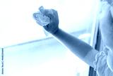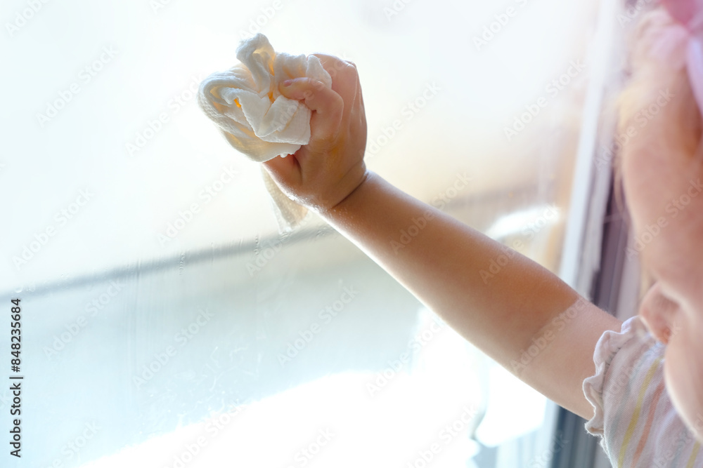 close-up female children's hand washing window, little helper, daughter joyfully clean dirty glass in streams of water and foam, use of detergent, concept of cleanliness, general cleaning of house