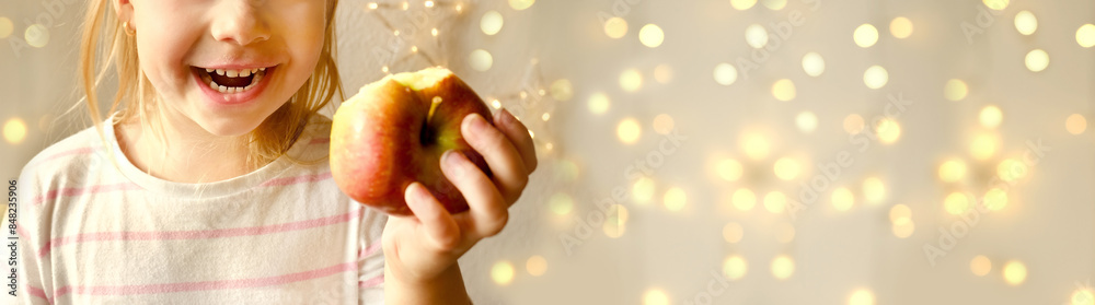 happy child, blonde girl 3 years old eating red apple, Vitamins, minerals, sweet dessert, kid has good appetite, Healthy food concept, happy childhood, health nutrition, balanced diet, sweet life