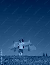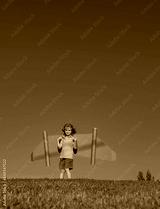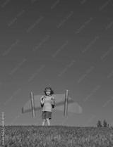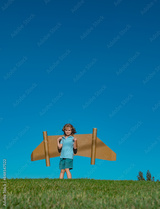 Kid imagination, child pilot with paper wings having fun at outdoor. Summer vacation and travel concept.