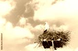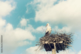 White Stork (Ciconia ciconia) standing on nest against beautiful sky with white clouds, vintage effects