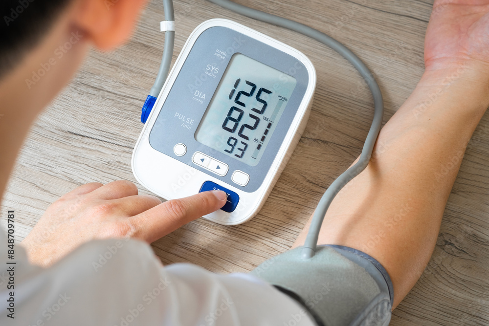 Man check blood pressure monitor and heart rate monitor with digital pressure gauge. Health care and Medical concept