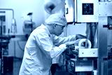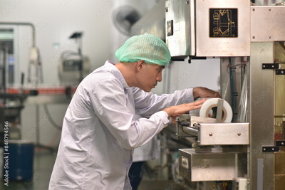 Worker in food factory chceking machine for packing product.
