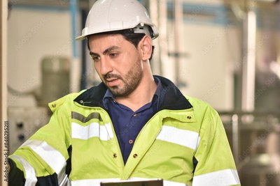 Manager inspecting in product factory. Engineer checking machine in factory. Worker in factory.