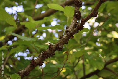 Damages on old Apple tree bark in the orchard. Apple tree with evidently expressed lenticels