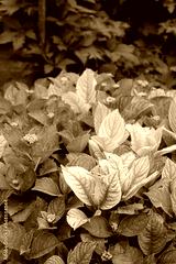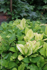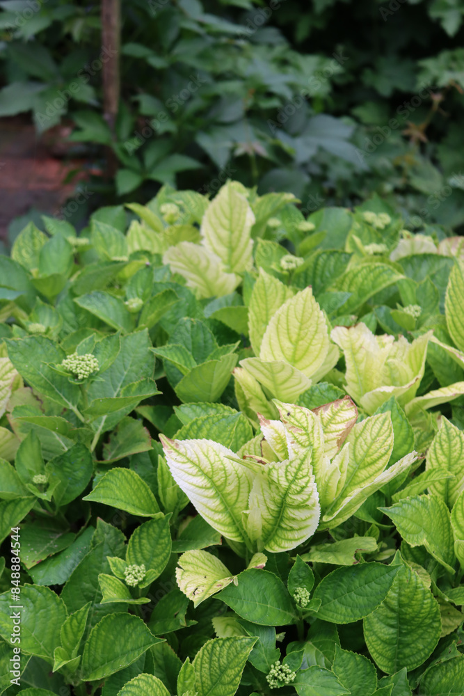 Close-up of iron chlorosis disease on hydrangea leaves. Hydrangea macrophyla on summer