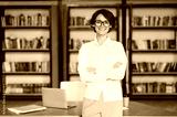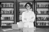 Young fun happy successful employee business woman she wear glasses white shirt casual clothes hold hands crossed folded stand near table work at office desk with pc laptop Achievement career concept