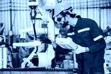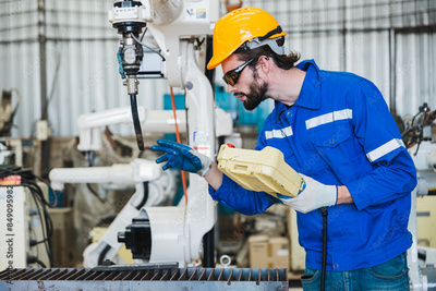 engineer controlling robot arm at factory. checking the operation of robot arm. Technology, automation, innovation and engineering concept.