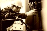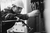 A mechanic is inspecting the oil level in the engine of a machine in a factory setting, A mechanic inspecting the oil level in the engine
