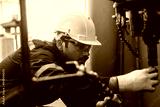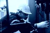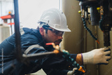 A mechanic is inspecting the oil level in the engine of a machine in a factory setting, A mechanic inspecting the oil level in the engine