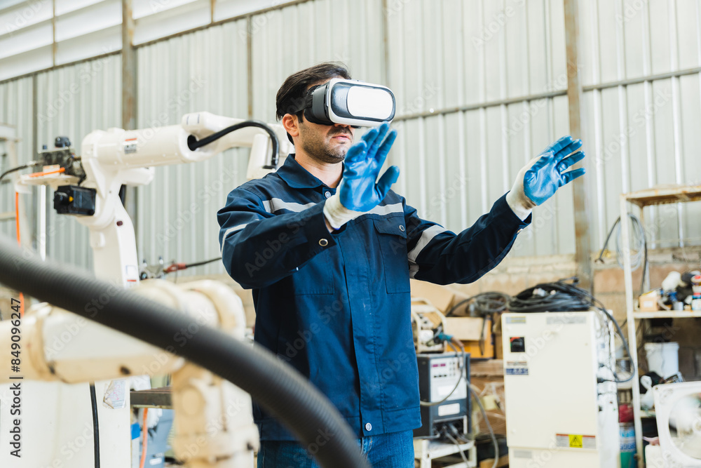 engineer using vr Glasses for controlling the robotic welding arm in the factory production line.