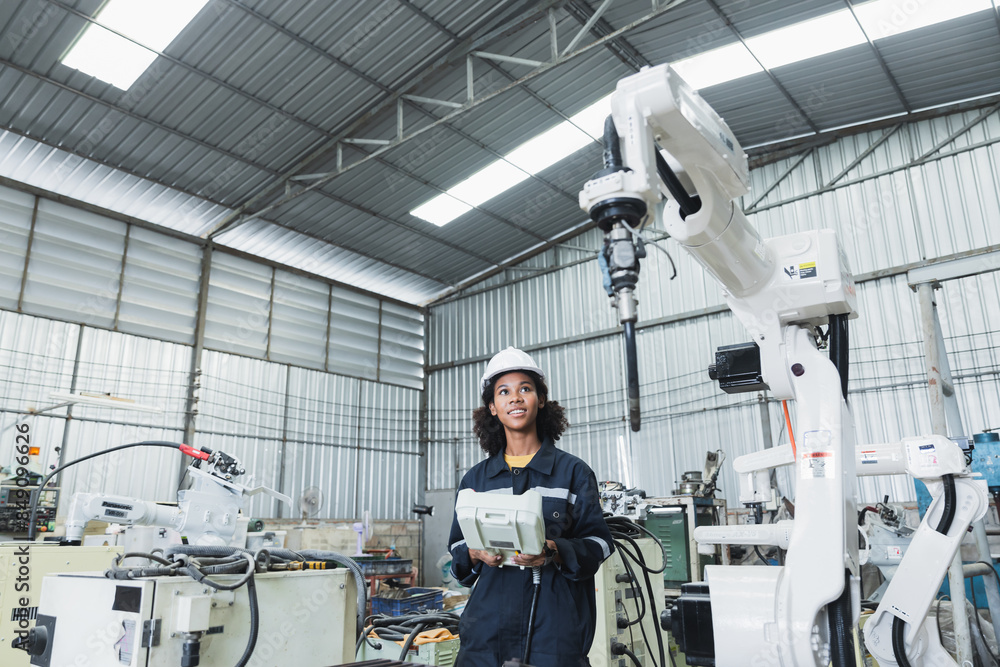 engineer controlling robot arm at factory. checking the operation of robot arm. Technology, automation, innovation and engineering concept.