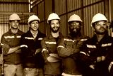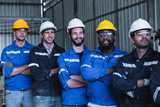 Team of successful group of male and female, corporate workers stand smiling together in industry factory