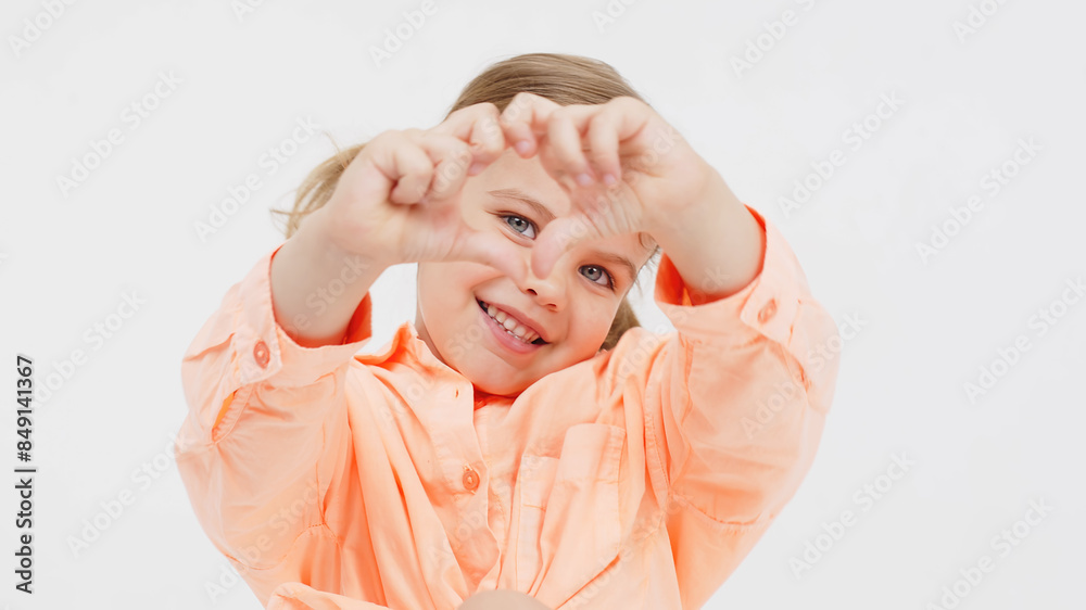 Adorable little girl with a heart sign on an isolated white background. Sending love and positive message concept.