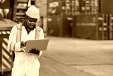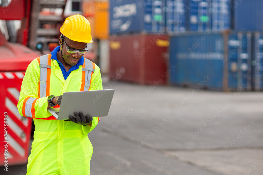 African Black Worker in Cargo Port Shipping Industrial in Yellow Hard Hat Safety Vest on Duty. Foreman or Supervisor in Container Ship Yard Terminal.
