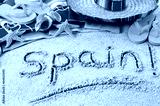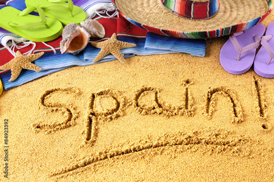Spain word written in sand on a sandy beach background with star fish and sombrero summer Spanish holiday vacation photo