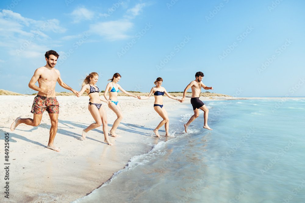 A summer day on a sandy beach, a group of five young people run towards the sea to swim. People are in swimwear on the beach and there are no other people.