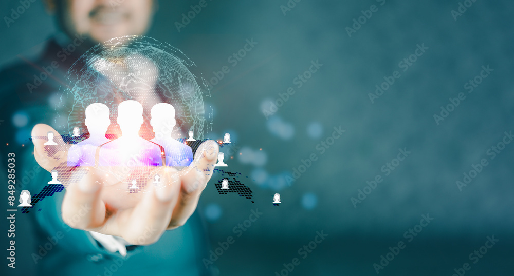 Man hand holding virtual global Internet connection. Business technology and digital marketing. Worldwide network solutions. Digital link tech and big data. Join business