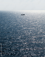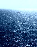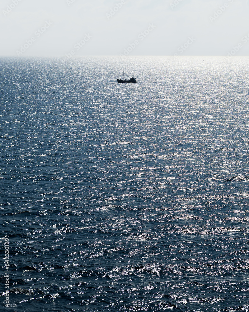The endless Atlantic Ocean with a small lonely fishing trawler in calm sunny weather. Landscape photography