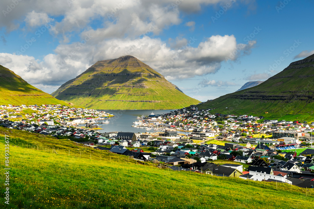 Klaksvik town with fjord, harbor and gorgeous mountains on background, Bordoy island, Faroe islands, Denmark. Landscape photography