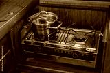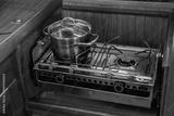 Cooking on the stainless stove on a sailing yacht in sailboat kitchen, sea life, retro design