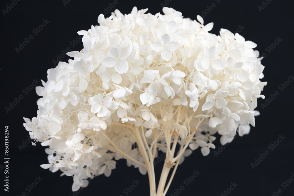 Blooming fresh hortensia white flowers gentle and romantic bouquet with black background macro