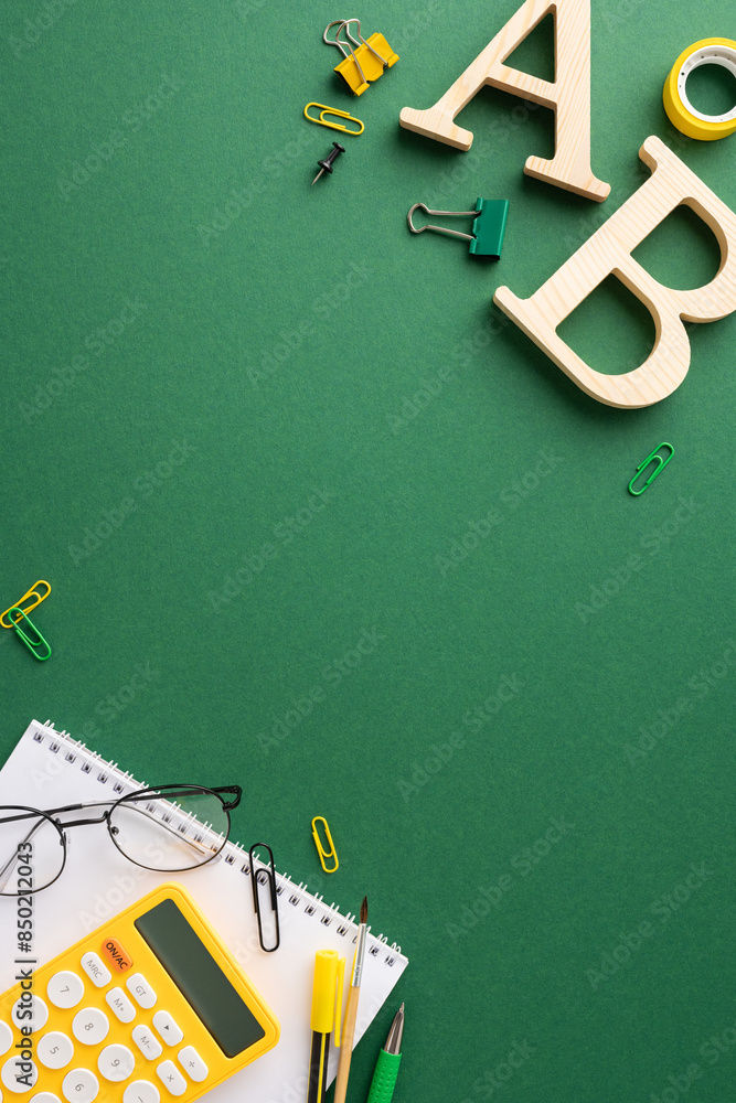Top vertical view of school supplies including a notebook, calculator, glasses, and desk accessories on a green background
