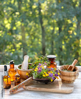 Bottles of herbal essentials, flowers of Marianne Oakwood (Melampyrum nemorosum) on table. close up. eco friendly care healthy organic product. The plant is insecticidal and anti-inflammatory