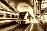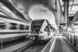 High-speed blue passenger train moving at railway station platform at sunset. Train station. Modern railway transportation concept with blurred motion effect. Railroad. Commercial. Rail transport