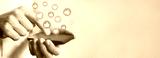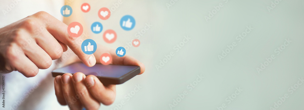 Social media and digital online communication concept, man using smartphone with likes icons on social media. Banner background.