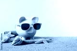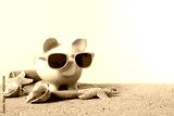 Piggy Bank or piggybank wearing sunglasses standing on a sunny tropical beach with towel holiday vacation retirement saving money plan photo