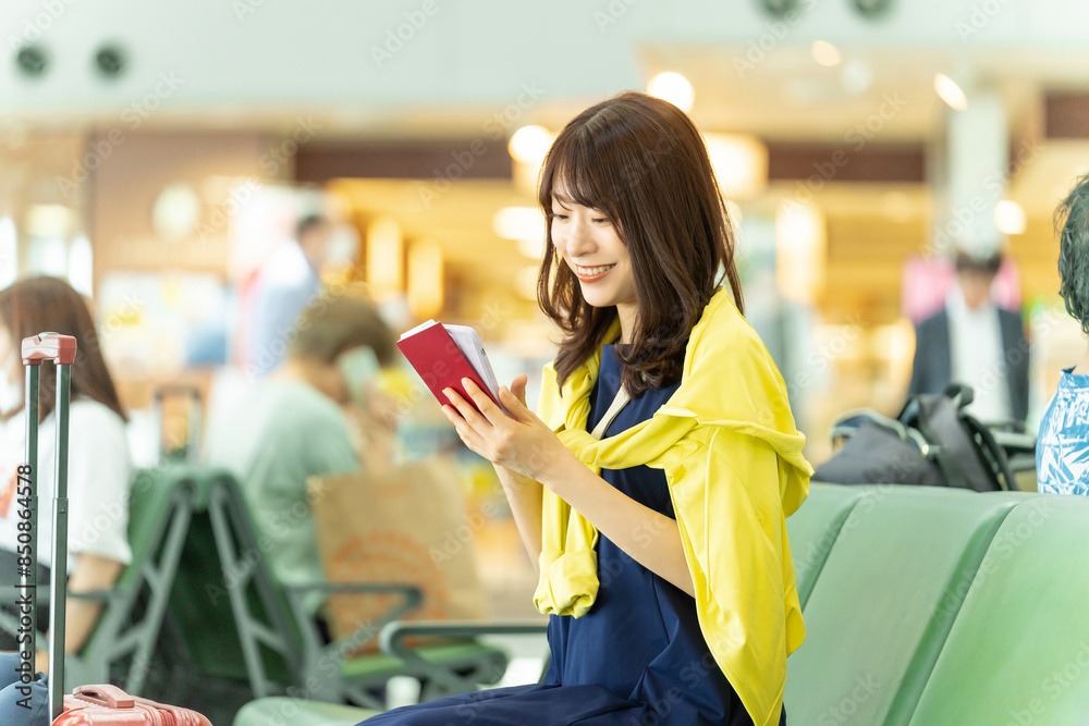 空港でスマホを使う旅行中の女性