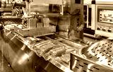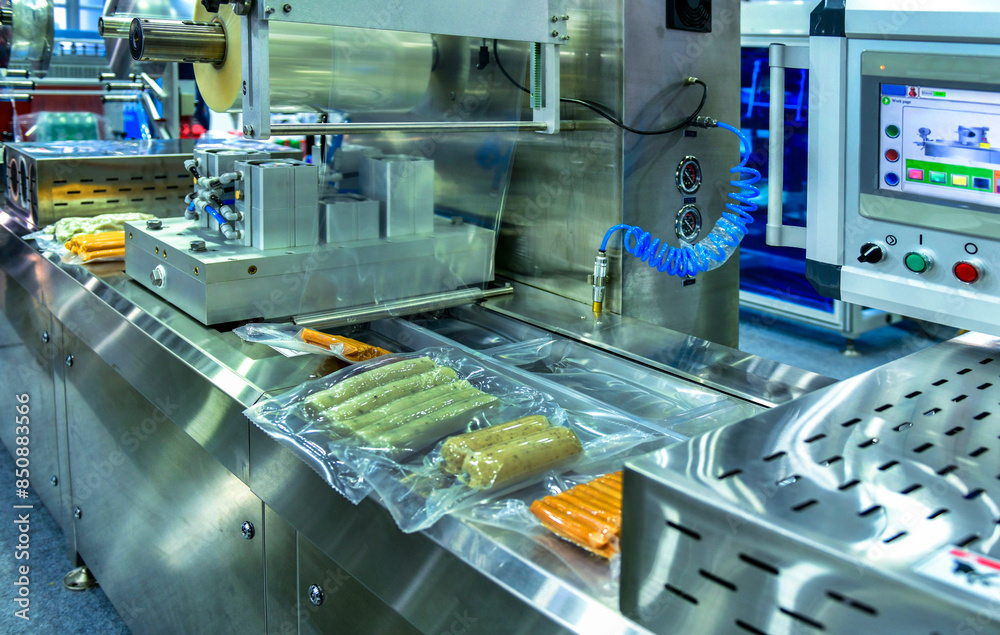 High-performance machines are wrapping processed fresh food products, pork, sausages.food production lines on conveyor belts, food production industry