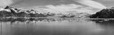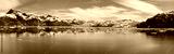 Panorama, Panoramic of Columbia Glaicer, snow covered mountains, and reflection in the water. A beautiful, calm, peaceful frozen landscape.