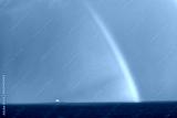 Rainbow at sea. Cargo vessel. Seascape, blue sea.