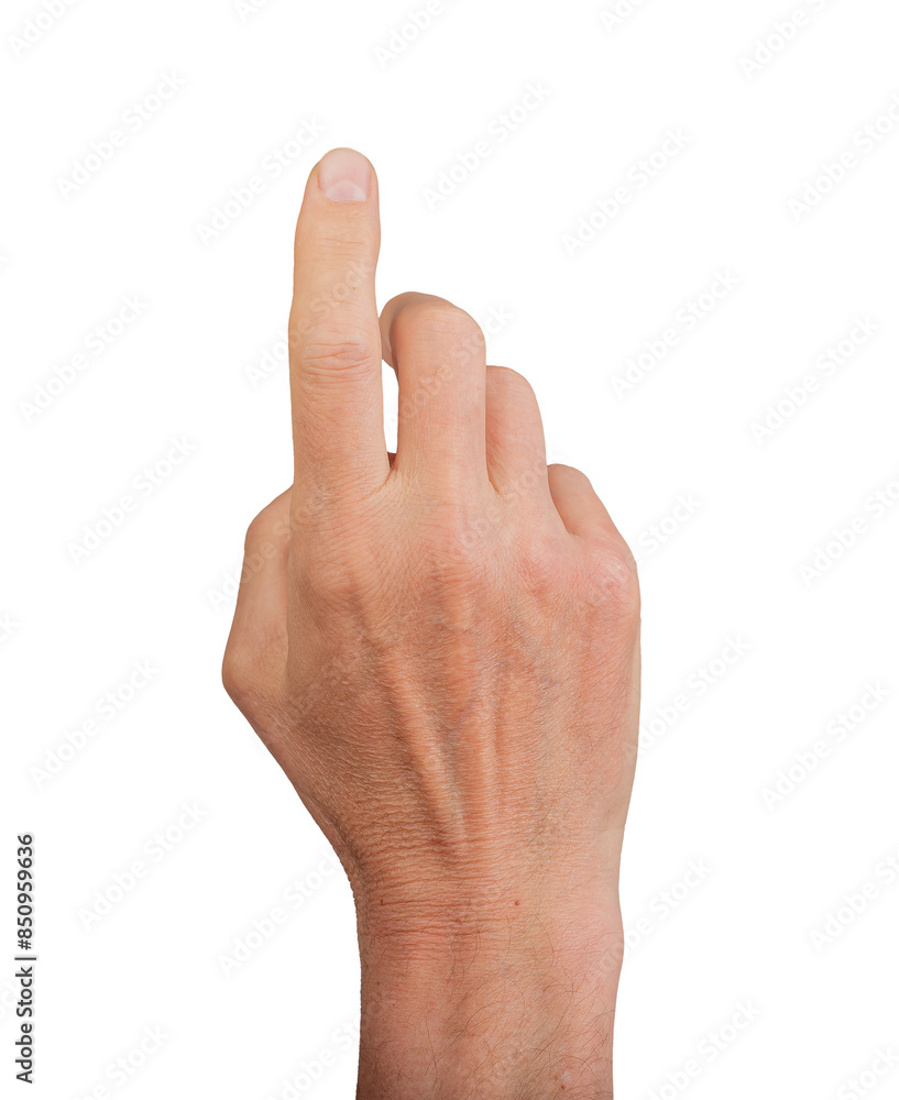 Finger touching, hand clicking. Gesturing index finger pointing, isolated white background. Press signal, choose selection. Human interaction, virtual screen tap, empty space, transparent cutout PNG