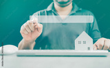 Search bar internet data browser with wood home. Man hand presses the information search button on touch screen, big data and accessing website information for rent or buy a home