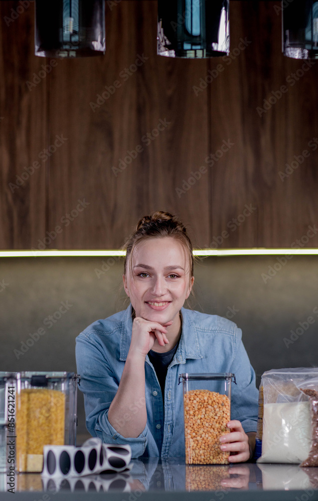 A woman uses containers to organize food in the kitchen. Layout and sorting of food products. Management of the organization in the interior of a modern kitchen.