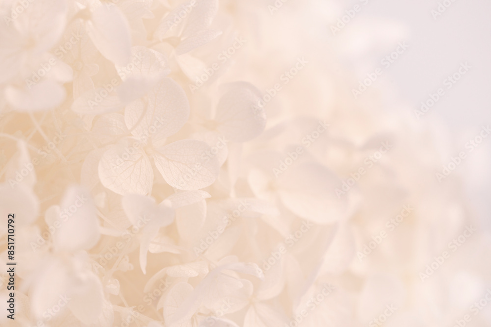Blooming hortensia fresh white flowers bouquet beige nautral colors on light background macro
