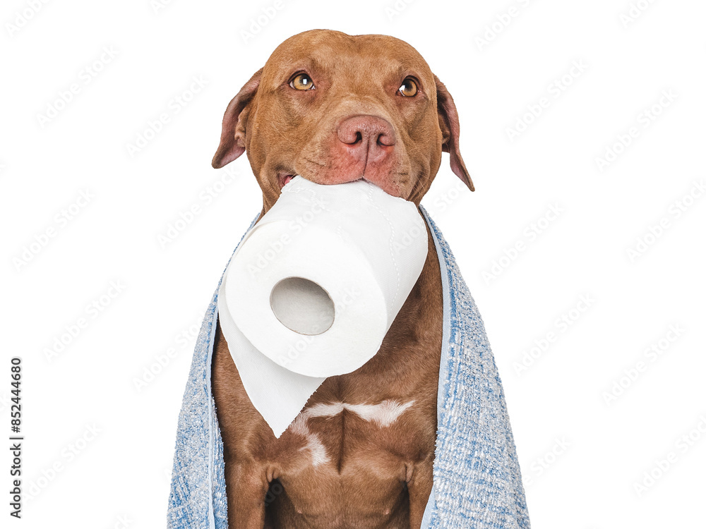 Cute brown dog holding a roll of toilet paper. Close-up, indoors. Studio shot. Concept of care, education, obedience training and raising pets. Hygiene and healthy lifestyle