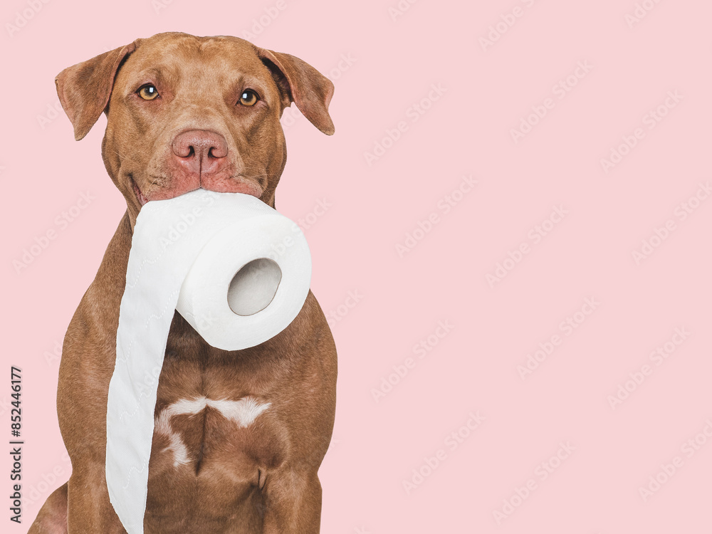Cute brown dog holding a roll of toilet paper. Close-up, indoors. Studio shot. Concept of care, education, obedience training and raising pets. Hygiene and healthy lifestyle