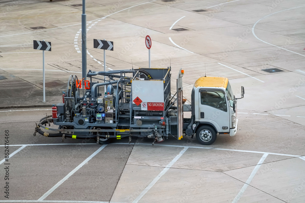 Refueling by high pressure fuel supply truck drives to the aircraft servicing stand
