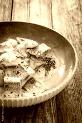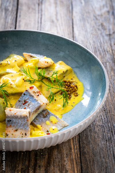 Marinated herring fillets in mustard sauce with dill and lettuce on wooden table