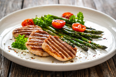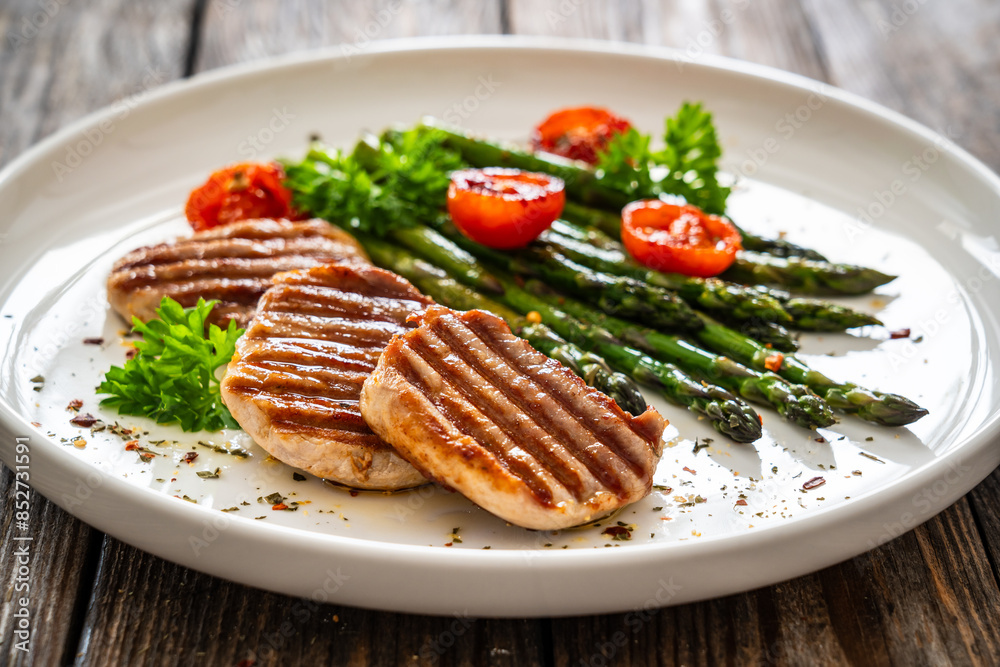 Pork loin steaks and cooked green asparagus on wooden table