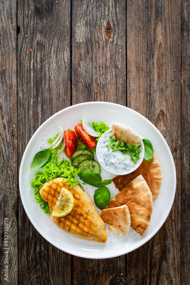 Seared chicken breast, pita bread and tzatziki on wooden table
