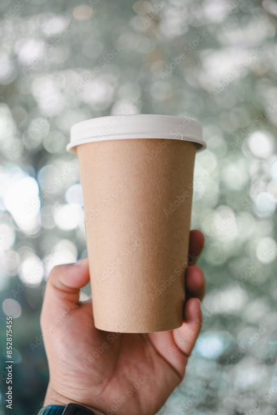 Hand holding brown paper cup for hot tea or hot coffee. Eco packget