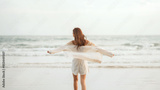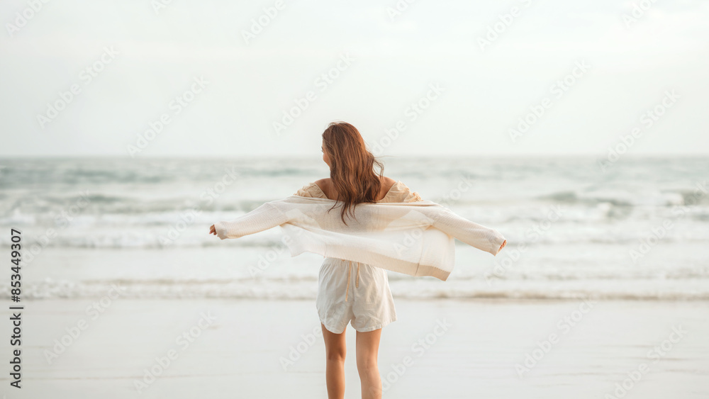 Rear view - Happy carefree young asian woman with freedom on the sea beach, Lady girl enjoying beach holiday, Summer beach vacation concept