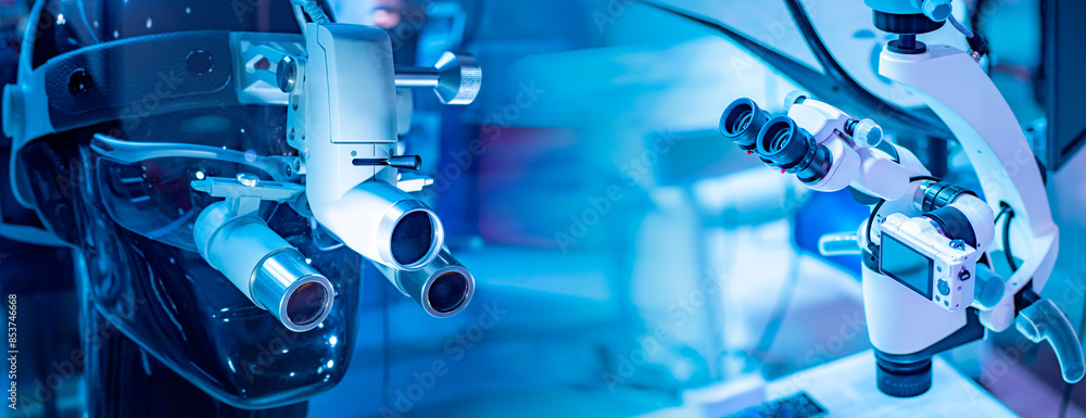 Scientific equipment. Electron microscope. Helmet for scientist. Microscope mounted on hardhat. Technologies for scientific work. Microscope combined with helmet. Equipment for multiple magnification