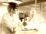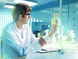 Man bioengineer. Laboratory assistant sits at table with test tubes. Scientist guy at work. Bioengineer in white coat. Scientist biologist works in laboratory. Man bioengineer studying reagents